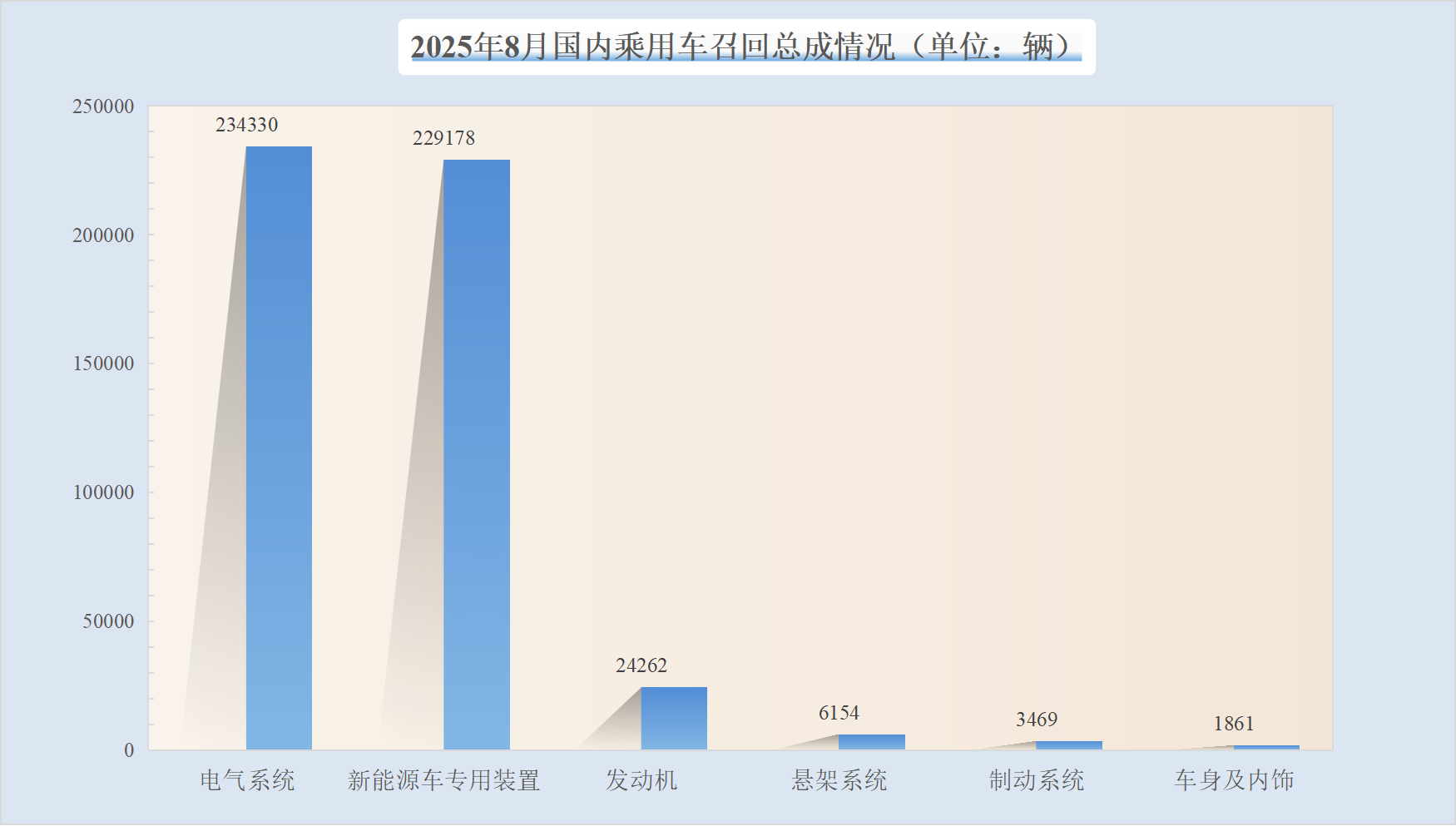 从召回原因来看,8 月乘用车召回问题集中在三大领域,按影响范围排序依次为电气系统、新能源车专用装置、发动机,具体问题及应对措施如下: