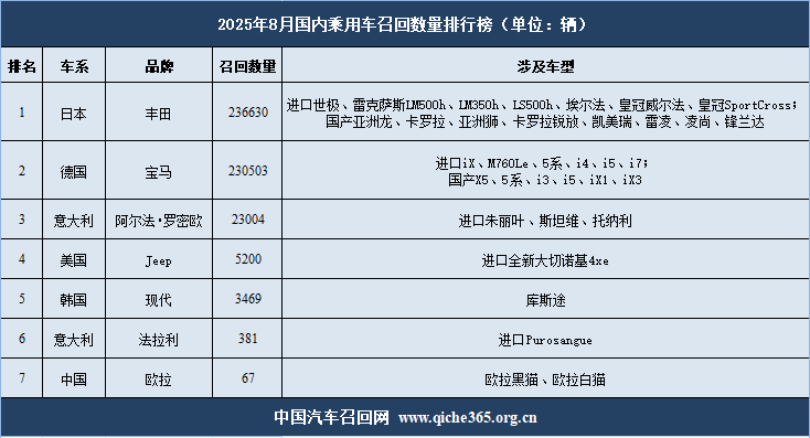 1. 车系和品牌维度:8月乘用车召回共涉及6个车系、7个品牌。其中,日系丰田品牌召回总量最多。