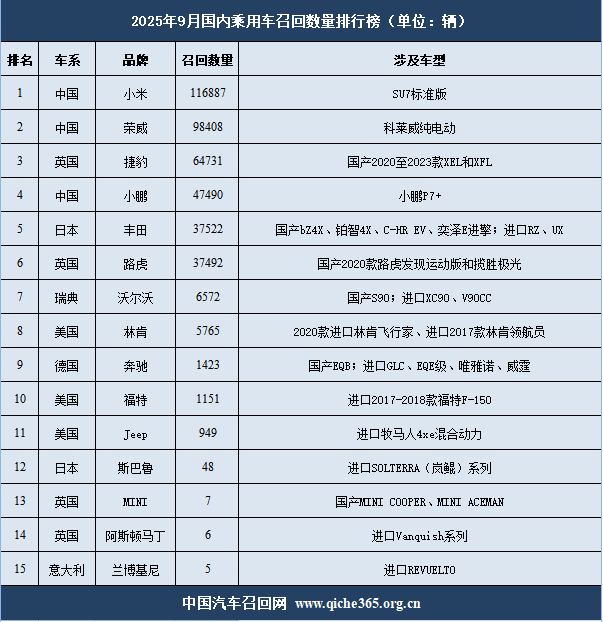 1. 车系和品牌维度:9月乘用车召回共涉及7个车系、15个品牌。其中,自主品牌小米汽车的召回总量最多。