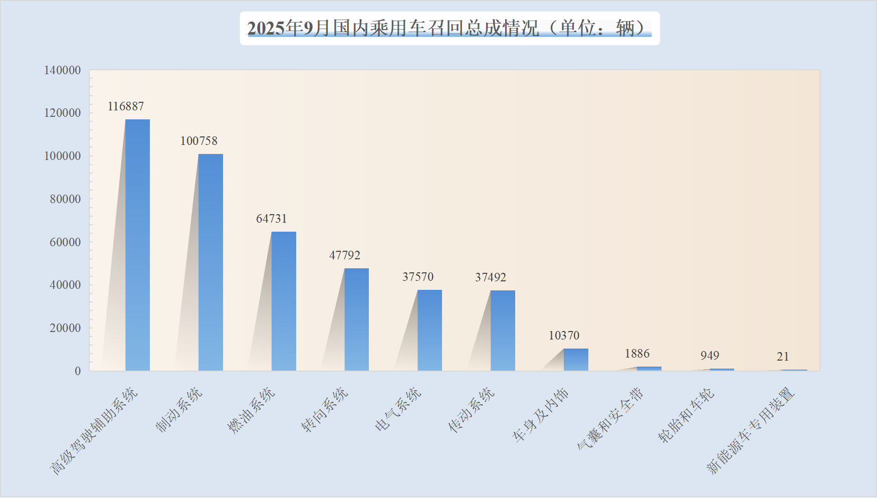 从召回原因来看,9月乘用车的召回问题体现在多方面,召回数量最多的依次为高级驾驶辅助系统、制动系统、燃油系统,具体问题及应对措施如下:
