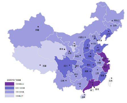 从互联网 汽车广告的发布省市来看,广东、江苏、浙江三省的互联网汽车广告过万条,分别为1.6万条,1.6万条和1.1万条,分别占全国互联网汽车广告的10.4%,9.9%和7.1%。