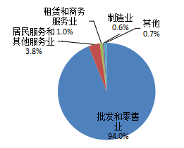 采集的互联网汽车广告涉及企业共8340户,与工商部门国家企业信用信息公示系统数据匹配后,共有1293户企业未匹配上登记信息,涉嫌无照经营,占比为15.5%。从匹配上的企业的行业分布来看,94%的广告发布企业从事批发和零售业,3.8%的企业属于居民服务和其他服务业,开展汽车整车及零部件的销售、维修业务。