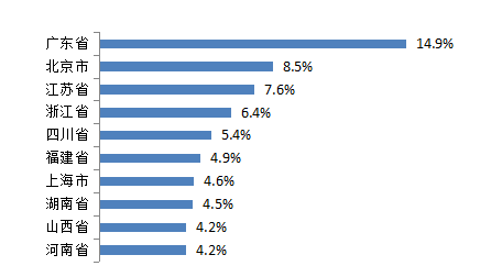 分省市来看,未匹配上登记信息的企业分散在全国各地,其中14.9%集中在广东省,占比最高;其次是北京市,占8.5%;江苏第三,占7.6%;前十省市合计占比65.3%,发布的广告量占比65.2%。