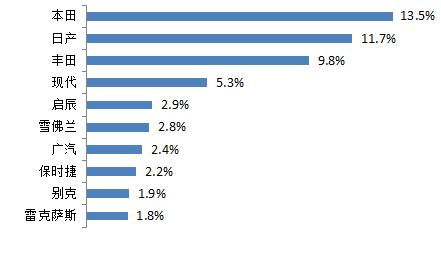 未匹配上登记信息的企业涉及的汽车品牌较多,其中本田、日产、丰田三个日系品牌排前三位,占比分别为13.5%、11.7%、9.8%,合计占比超过三分之一;其次是现代,占比5.3%。