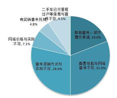 汽车相关广告投诉案件中,24.06%利用网络进行虚假宣传,投诉的主要问题主要为:实际配置和性能与网络宣传不符(占31.0%),宣传促销方式与实际不符(占28.6%),利用微信等方式帮助宣传,商家不兑现承诺(占19.0%),二手车已行驶里程或过户等信息与网络宣传不符(占9.5%)。
