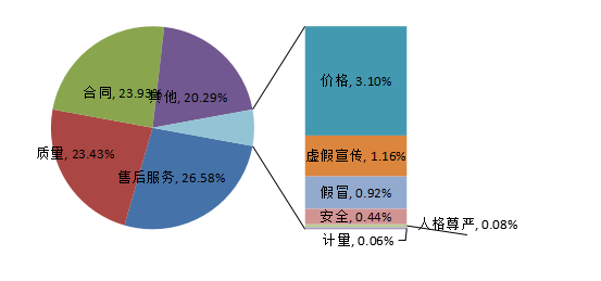 根据投诉性质(如表2所示)划分:售后服务投诉4,164件,合同投诉3,748件,质量投诉3,670件,价格投诉486件,安全投诉69件,虚假宣传投诉182件,假冒投诉144件,人格尊严投诉13件,计量投诉9件,其他投诉3,178件。售后服务问题、合同争议和产品质量是引发投诉的主要原因,超过投诉总量的70%(如图2所示)。