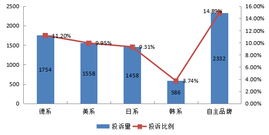 根据中国消费者协会统计(图3),2016年自主品牌汽车的投诉量为2,332件,占全年投诉总量的14.89%,排名第一,德系品牌汽车投诉1,754件,占全年投诉总量的11.20%,排名第二;美系品牌汽车投诉1,558件,占全年投诉总量的9.95%,排名第三。