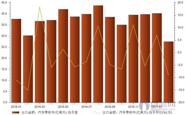 据前瞻数据库数据显示,2017年2月我国汽车零部件出口金额为27.57亿美元,当月同比减少9.05%。