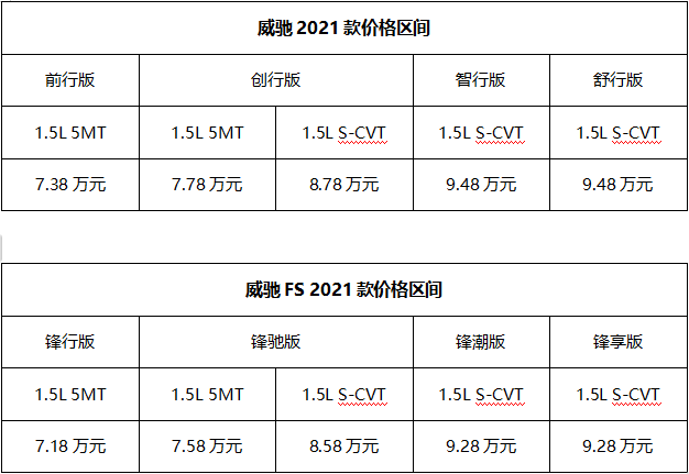 2020年8月17日,一汽丰田正式公布了全新升级的威驰家族2021款,其中威驰售价区间为7.38-9.48万元,威驰FS售价区间为7.18-9.28万元。本次威驰、威驰FS均推出5款车型可供消费者选择,全系均搭载1.5L发动机,并在外观、配置上进行全面提升,不光在造型上进一步迎合了年轻人的审美标准,性价比更是超越同级,重新定义同级标杆。