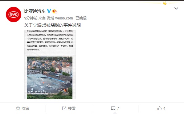比亚迪回应宁波多台e5电动汽车被烧燃事件:初步判断是人为纵火