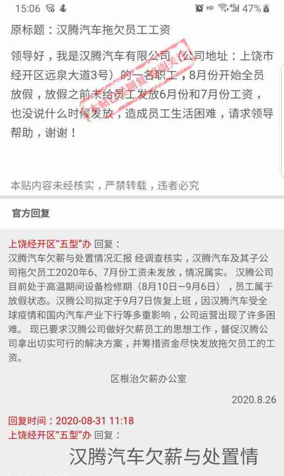之所以遭遇频频放假的安排,是汉腾汽车的生产经营正面临前所未有的困难。其多位员工表示,公司6、7月份的工资至今仍未尚未发放,即使是高温假期间工资都是按每月1430元的最低工资标准计算,“扣扣社保就没了”。根据上饶市经开区根治欠薪办公室透露,经调查核实汉腾汽车及其子公司拖欠员工6、7月份工资未发放的情况属实。