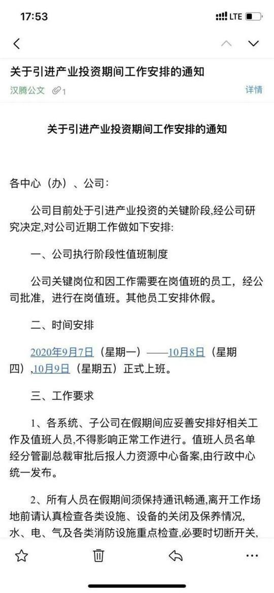 据《汽车公社》媒体援引内部人士了解到,9月3日,该人士收到了一份标注为“汉腾公文”的《关于引进产业投资期间工作安排的通知》。根据该《通知》,公司大部分员工将自9月7日至10月8日继续休假,10月9日正式上班。