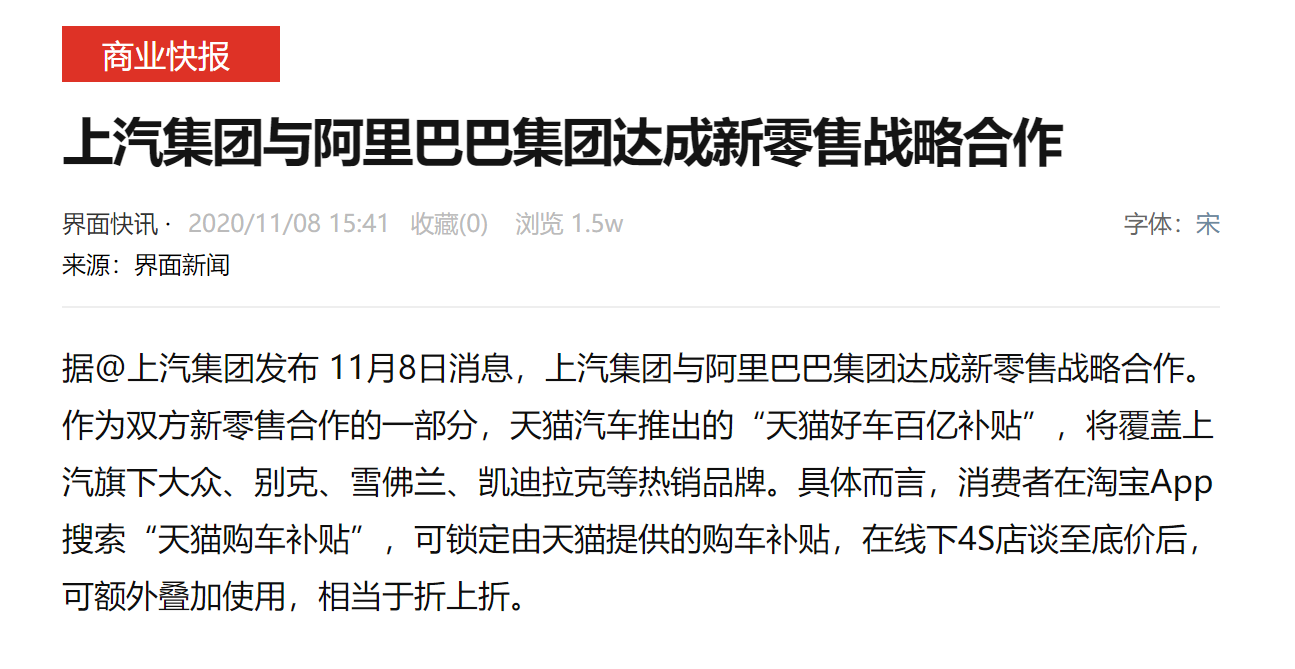 11月8日,上汽集团与阿里巴巴集团达成新零售战略合作。作为双方合作的一部分,天猫汽车推出的“百亿补贴”,覆盖大众、别克、雪佛兰、凯迪拉克以及荣威、名爵、大通、五菱、宝骏等品牌。具体来看,消费者可以在淘宝上锁定由天猫提供的购车补贴,在线下4S店谈至底价后叠加使用。