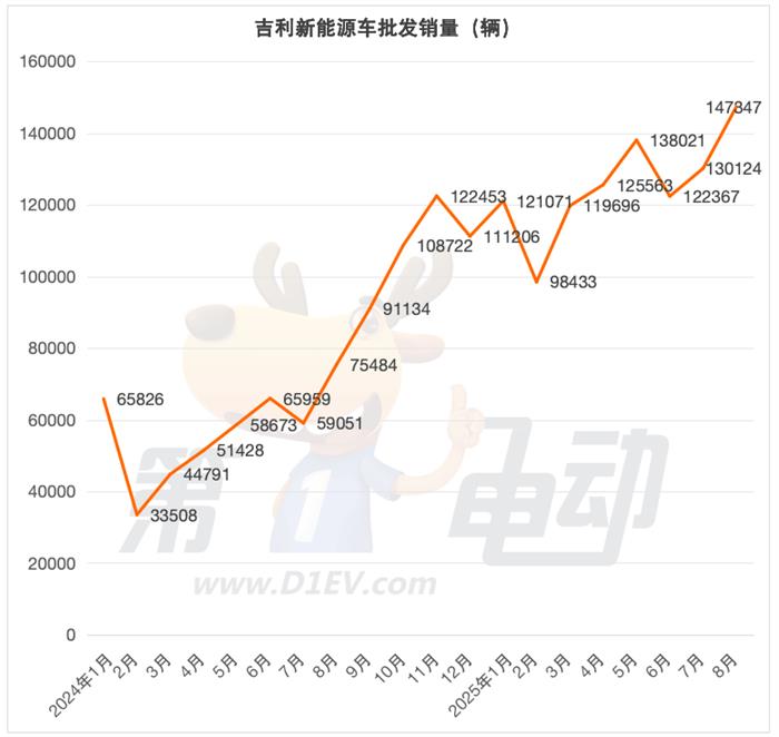 吉利新能源8月销量达14.73万辆,环比上涨13.2%,同比大涨95%,创历史纪录,紧随比亚迪其后。
