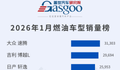 根据盖世汽车研究院数据,2026年1月乘用车市场中,新能源汽车与燃油车呈现出并行发展的态势。新能源车型在电动化与智能化驱动下持续保持较高热度,多款新车型快速放量...
