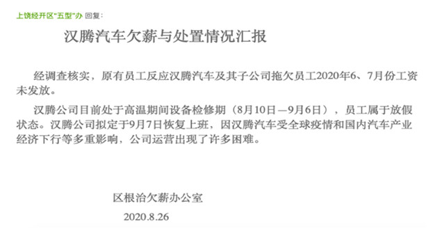 汉腾汽车拖欠两个月工资?官方:9月18日保证发放
