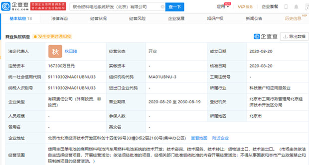 8月20日,联合燃料电池系统研发(北京)有限公司成立。该公司工商披露的股东共有6位,其中,第一大股东为丰田汽车公司,持股比例为65%。&...