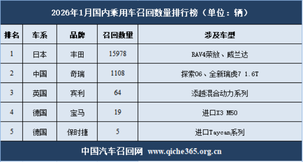 2026年1月份中国汽车召回网分析报告