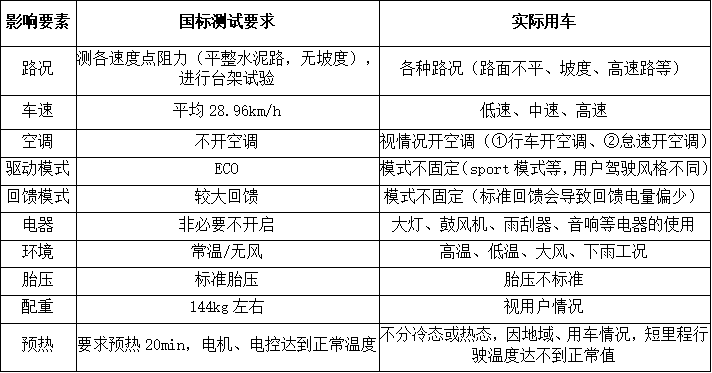 如上表所示,实际用车时,因路况、车速、空调、环境、电器使用状态等多方面条件与测试条件均存在差异,整车实际能耗大,从而造成车辆的实际续驶里程低于标称续驶里程的现象。