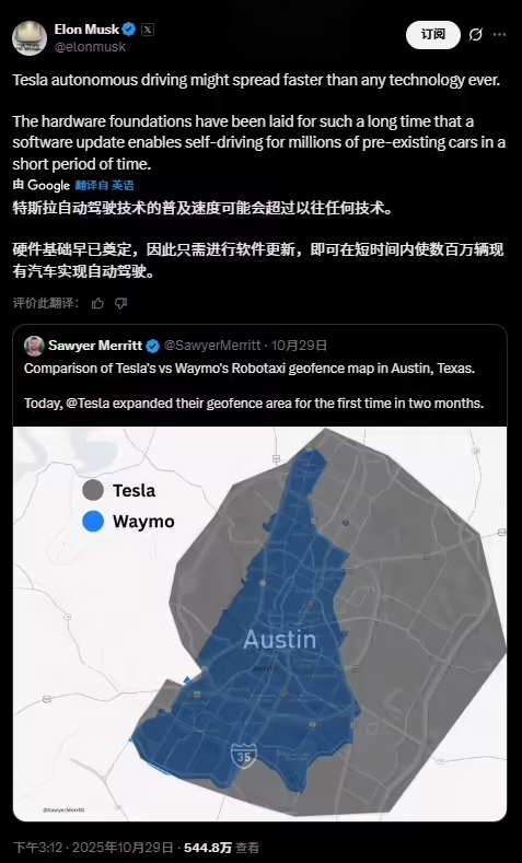 这是自今年 8 月以来,特斯拉在奥斯汀进行的第二次重大服务范围扩展,彰显了该公司在自动驾驶出行市场抢占主导地位的决心。随着特斯拉与 Waymo 竞相证明自身技术的规模化能力和可靠性,马斯克的信心表明,真正的竞争或许并不在于谁先完成技术突破,而在于一旦技术全面激活,谁能以更快的速度在整个车队中实现部署。