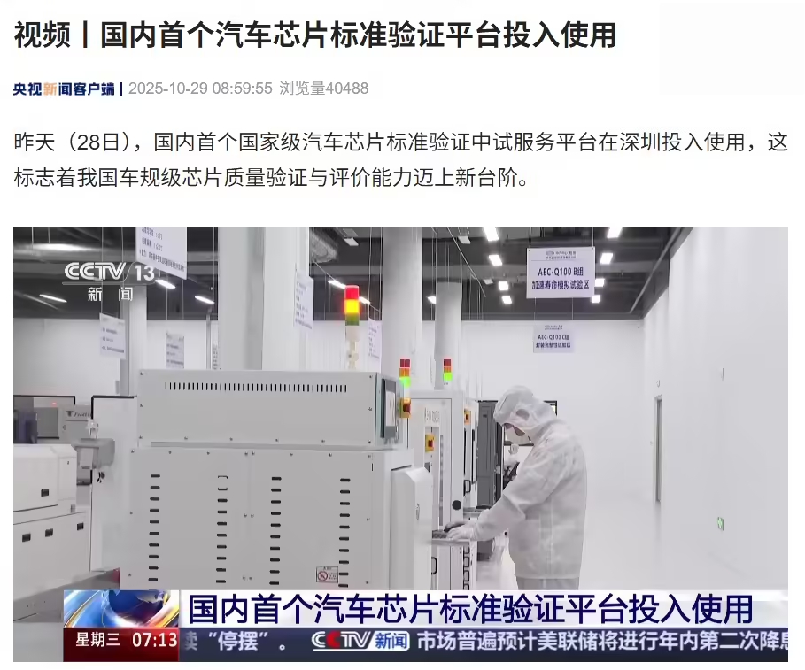 IT之家 10 月 29 日消息,据央视新闻报道,国内首个国家级汽车芯片标准验证中试服务平台于 10 月 28 日在深圳投入使用,这标志着我国车规级芯片质量验证与评价能力迈上新台阶。