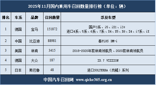 中国汽车召回网讯 据国家市场监督管理总局于2025年11月份发布的国内乘用车召回公告分析:11月份共发布乘用车召回公告9则,涉及召回乘用车总量共计244,503辆,环比2025年10月份增加了24.47%。由于召回数量会受到很多因素的共同影响,因此,不能片面地以召回数量的多少来评价汽车质量水平的高低或召回监管力度的大小。