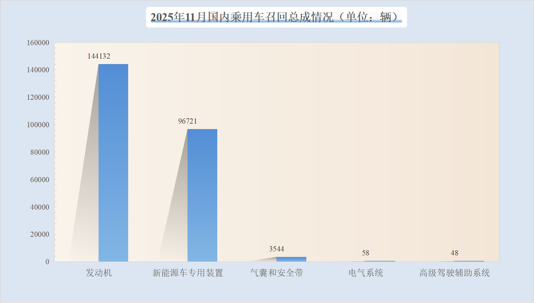 2. 召回问题维度:发动机、新能源车专用装置、气囊和安全带是11月乘用车召回的主要原因。其中,宝马因起动机继电器密封问题发布的召回活动成为本月最大规模单次召回。