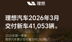 2026年4月1日,理想汽车公布2026年3月交付数据。2026年3月,理想汽车交付新车41,053辆。截至2026年3月31日,理想汽车第一季度交付量为95,...